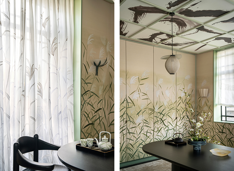 Perhaps the most serene corner of the showroom is the tea room, which features a Tai Chi composition. Inspired by classical calligraphy, the design utilizes semi-dry brushstrokes that seem to dance across the surface with an effortless, kinetic grace.