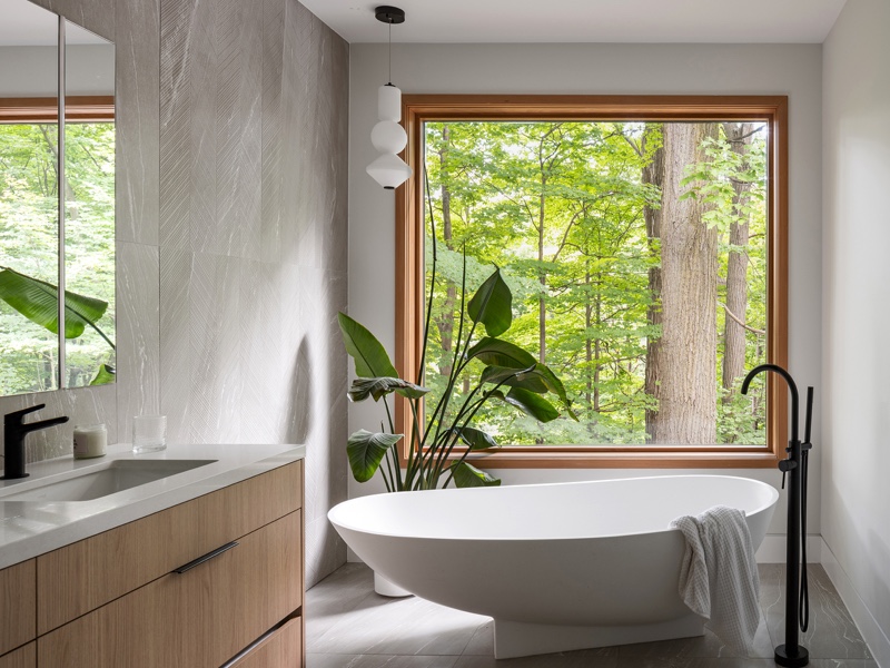 Set within this scenic landscape, the 7,080-square-foot North York Ravine House exemplifies harmony with its surroundings. Perched on the edge of a lush Toronto ravine, Denegri Bessai Studio pairs a bold, modernist silhouette with the quiet intimacy of the forest greenery. Sleek, carefully curated, and fully immersive, the home invites its inhabitants to live seamlessly between city and nature.