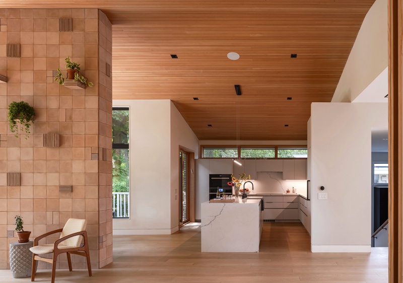 “The interiors are grand yet relaxed,” Bessai says. “Rich wood tones link the home to the surrounding forest. Sloped ceilings of Douglas fir, white oak floors, and simple spatial forms allow natural light to fill the spaces.”