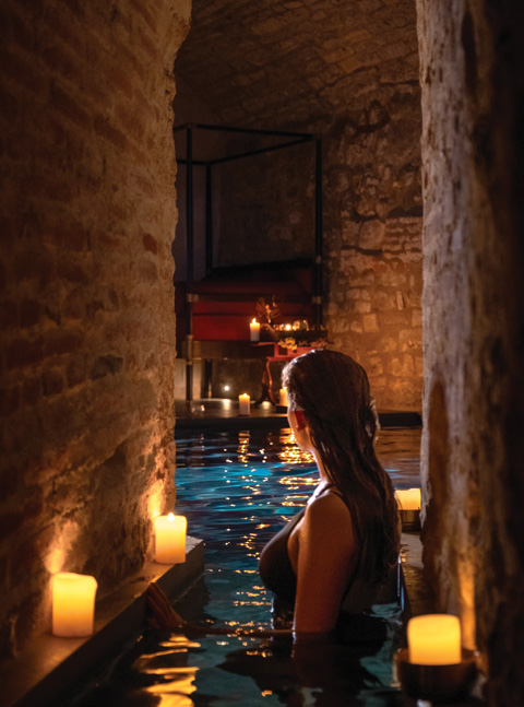 Worn stone steps, once leading to the wine cellar, now descend into The Bathhouse—a serene spa whose star feature is a large saltwater pool, inspired by the coveted well-being traditions of ancient Roman baths. At the top of the tower, two secret, centuries-old dovecotes, each flickering with candlelight, have been transformed into cosy hideaways for nightcaps.