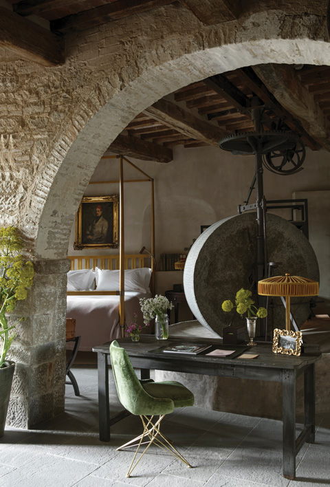 Far beyond the noise of cities, deep within the green hush of Umbria’s countryside, sleeps a castle, where curlicued vineyards thread through the mist that drapes the hills each morning.
