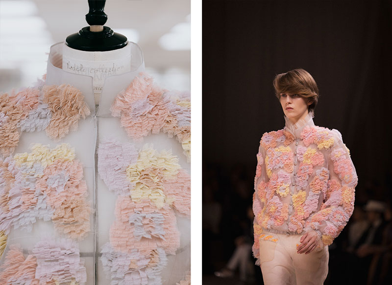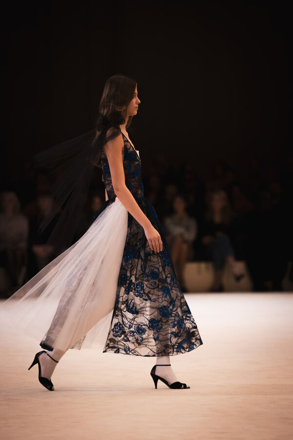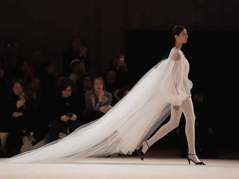 The Spring-Summer 2024 CHANEL Haute Couture collection is an ode to the art of dance, unfolding like a delicate landscape. Sheer skirts, floor-sweeping dresses, jumpsuits, and capes are adorned with embroidery, bows, sequins, braids, and flowers. Masculine and feminine silhouettes celebrate the beauty and strength of the dancer’s body, with pieces worn over white ballet leotards and tights.