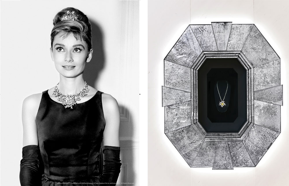 Left: Audrey Hepburn wearing the Ribbon Rosette setting from the Breakfast At Tiffany’s film. Right: In-store display of the 128.54-carat Tiffany Diamond. Audrey Hepburn-Trademark and Likeness property of Sean Hepburn Ferrer and Luca Dotti