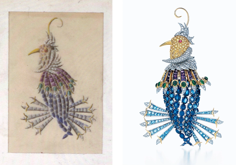 Jean Schlumberger Bird of Paradise Clip Sketch and the real clip, 1962-63, by Tiffany