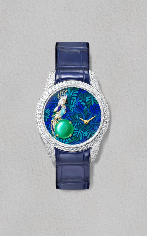 If the clock is a theatrical set piece, the Paradise Bird Parrot watch is a miniature, wearable painting.