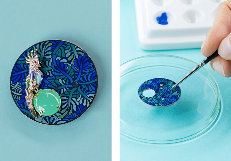 Left: The finished dial of Paradise Bird Parrot watch. Right: An artisan hand paints with enamel the dial in a nature-inspired motif.