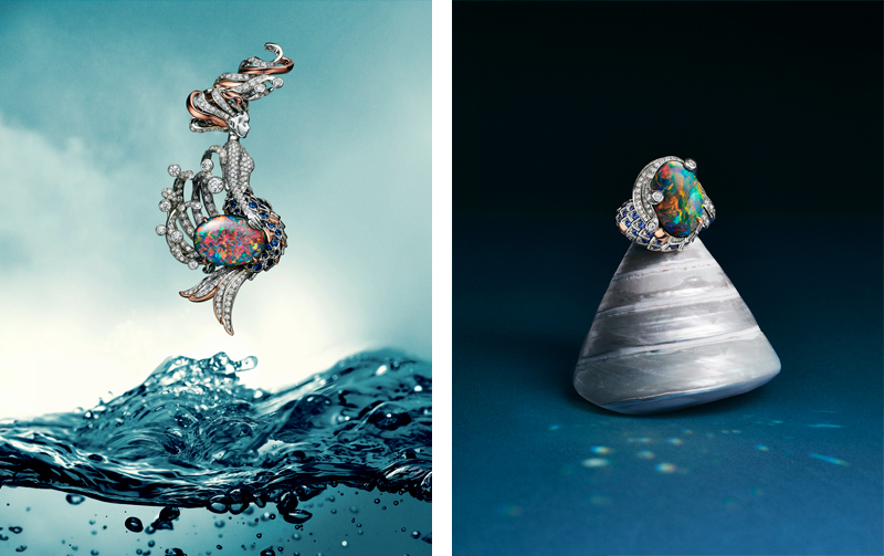 In the Mermaid chapter, Tiffany leans into legend. A dramatic brooch in rose gold and platinum unfolds in scales, curls, and undulating lines. And at its heart glows a 10-carat black opal—a water-dark gem that anchors myth and matter. The mermaid becomes metaphor: not a fantasy to be tamed, but a mystery to be worn.