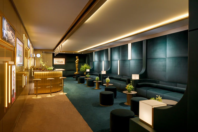Lighting the space is a series of soft, brushed-champagne accents and gold-toned anodized metals that provide a flattering, amber-hued warmth. It is the sort of light that suggests everyone in the room has just returned from a very successful yachting trip in 1954.