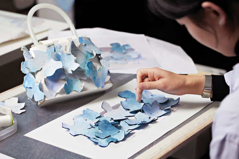 Left: The laborious process of making the 3D fish scales for the Capucines MM Floating Fish bag. Right: The completed bag. Left: Photos by Piotr Stoklosa. Right: Photos by Philippe Lacombe